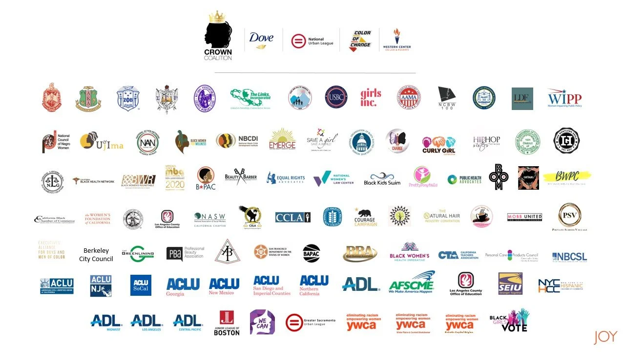 The CROWN Coalition is an alliance of organizations, including founding members Dove, National Urban League, Color Of Change, and Western Center on Law and Poverty, that is dedicated to the advancement of anti-discrimination legislation across the United States. With the help of a diverse array of organizations in the social justice, business, legal, and education sectors, the CROWN Coalition has had tremendous success elevating the public narrative around this important issue and inspiring a movement to end hair bias and discrimination.